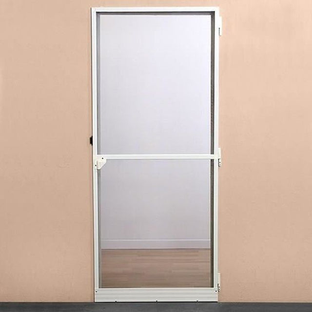 Moustiquaire porte battante en aluminium blanc de qualité supérieure. Protection efficace contre les insectes. Vantail monté sur charniere avec ouverture a 180° et retour automatique. Toile en fibre de verre.
