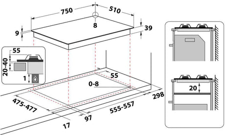€707,34Prix unitaire /Indisponible HOTPOINT PNN 751 IX Plaque de cuisson gaz - 5 foyers - 10,5kW - L75 x P51cm - Revetement inox - Inox