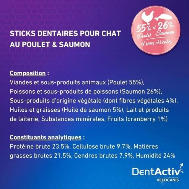 DentActiv - 10 Bâtonnets - VETOCANIS - Hygiene Bucco-Dentaire au Saumon pour Chat est en rupture de stock et sera expédié dès qu’il sera de retour en stock.