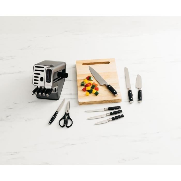 Découvrez le jeu de 14 couteaux StaySharp de NINJA, en acier inoxydable allemand. Ce bloc élégant comprend un couteau de chef, un couteau a pain, un couteau a trancher, un couteau Santoku, un couteau utilitaire, un couteau d'office, des couteaux a steak et des ciseaux. Avec un aiguiseur intégré, vos couteaux resteront aiguisés pendant 10 ans. Parfait pour tous vos besoins culinaires !