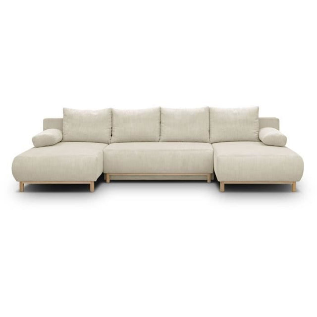 Canapé panoramique convertible - 6 places - MIKA - Velours côtelé Beige - Coffre de rangement - 313 x 84 x 145 cm