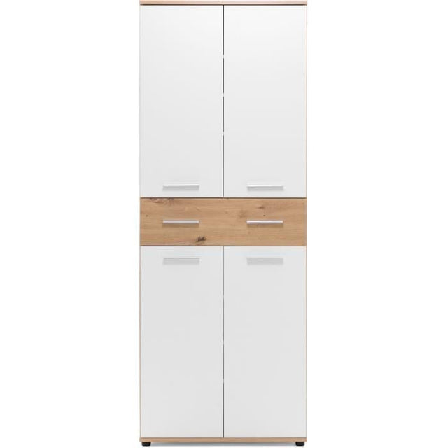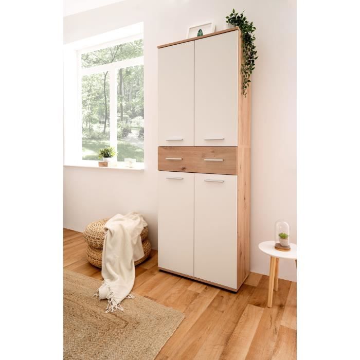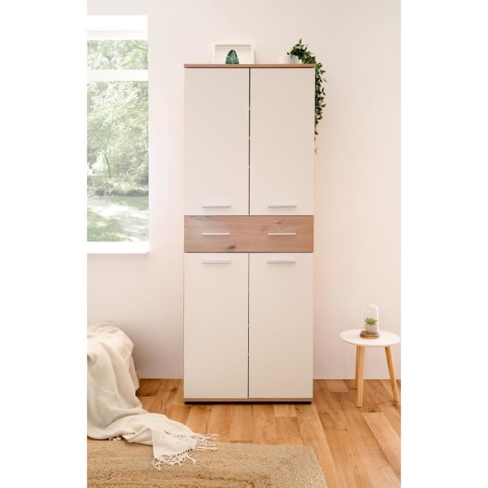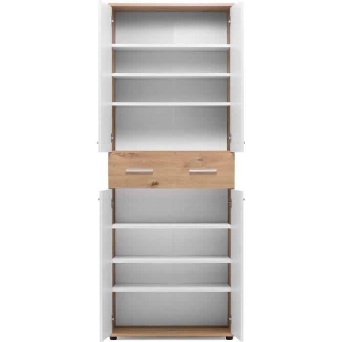 Meuble a chaussures Jacky 42 - Chene Artisan / Blanc - 70 x 185 x 35 cm - 6 Étageres - 1 Tiroir - Capacité 24 Paires