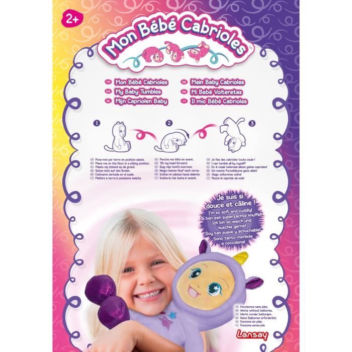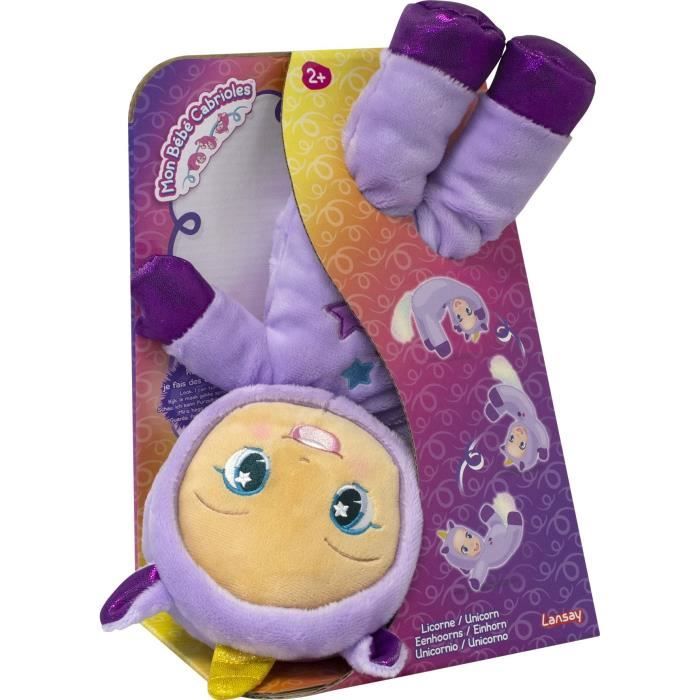 Ta poupÈe Mon BÈbÈ Cabrioles Licorne adore faire des galipettes dans son joli pyjama licorne qui brille ! Mets-la en position assise et fais basculer sa tete en avant pour la voir faire des cabrioles. Elle est toute douce et tres c‚line. Cette poupÈe a fonction est destinÈe aux enfants a partir de 2 ans et fonctionne avec des piles. Dimensions : 19 x 12 x 27 cm.