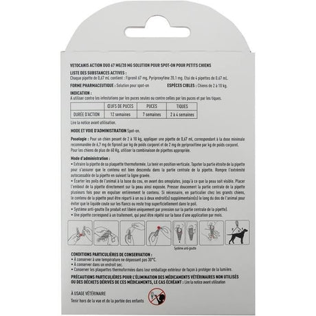 Pipettes - VETOCANIS - x4 Pipettes Anti-puces et tiques Duo 67mg/20mg pour Petits Chiens