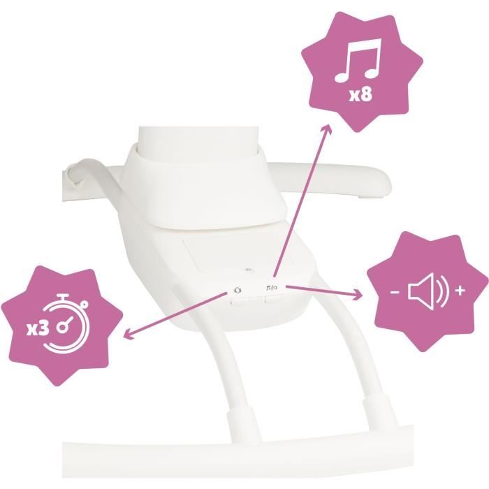 Balancelle électrique : reproduit le mouvement naturel des bras des parents - 3 vitesses de balancement - Confortable : cale tete intégré et forme du siege adaptée au dos des nouveau-nés - Arche de jeux pour susciter la curiosité de bébé - 8 berceuses et harnais sécurisé (5 points)