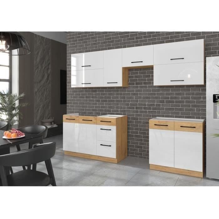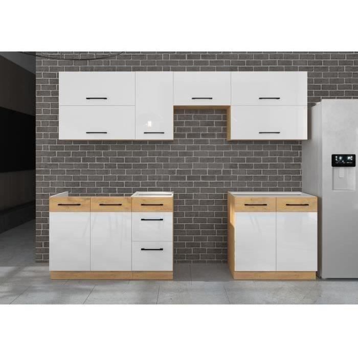 ROCK - Cuisine complete - Mélaminé chene Lancelot et Blanc brillant - 260 cm - Plan de travail non inclus
