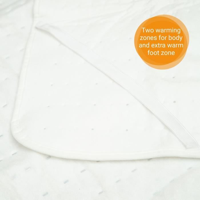 Le surmatelas chauffant MEDISANA HU 662 dispose de 2 zones chauffantes pour le corps et les pieds, lavable grâce au régulateur de température amovible, 6 niveaux de température, tissu label qualité oeko-Tex® Standard 100, arret automatique apres 180 minutes et systeme de sécurité avec protection contre la surchauffe. Dimensions : 150 × 80 cm (L x l).