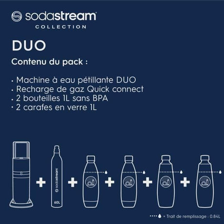 Machine a soda et eau pétillante SODASTREAM - DUO Noire - 2 carafes en verre - 1 recharge de gaz 60L