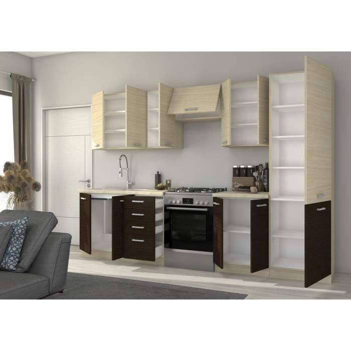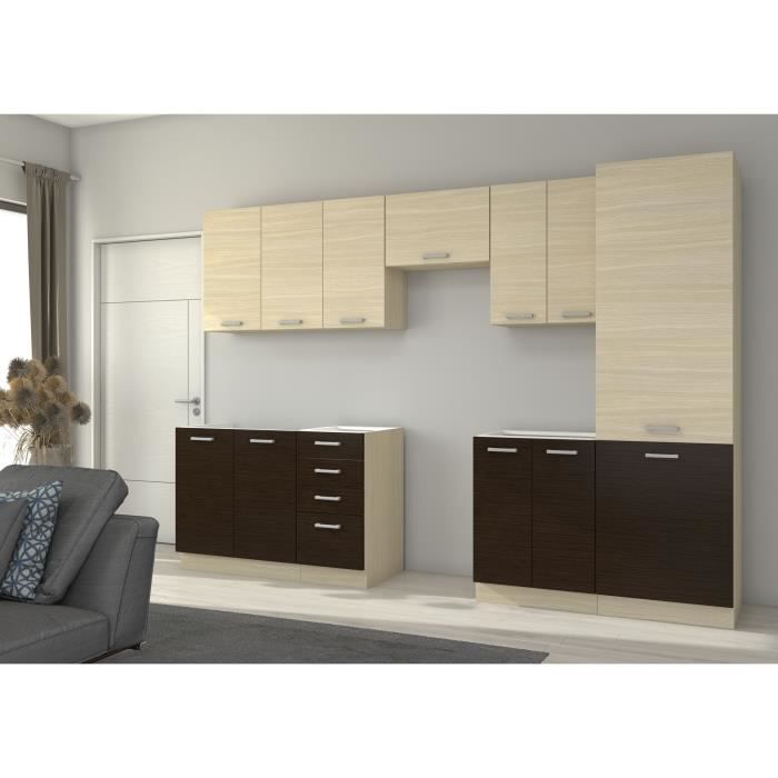 Cette cuisine complete CHAMONIX de 300cm est composÈe de 3 meubles bas, 4 meubles hauts et une colonne. Elle possede une finition aspect bois et des poignÈes standards. a monter soi-meme, elle convient pour une cuisine linÈaire et est de couleur marron avec un dÈcor chene clair. Les portes et tiroir(s) sont inclus.