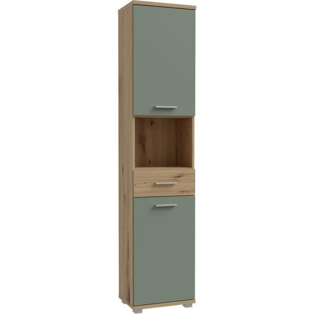 Meuble de salle de bain - Colonne - Décor Chene et Vert sauge - 2 portes - L40,2 x P28,9 x H183,6 cm