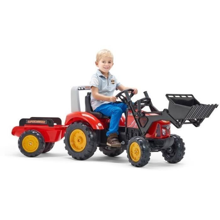 Tractopelle a pÈdales SuperCharger spÈcialement conÁu pour les baroudeurs de 3 a 7 ans qui prendront plaisir a creuser ou terrasser gr‚ce a sa pelle frontale entierement articulÈe. Le capot ouvrant permet d'accÈder au moteur pour vÈrifier courroies, filtres et bougies - Remorque incluse.