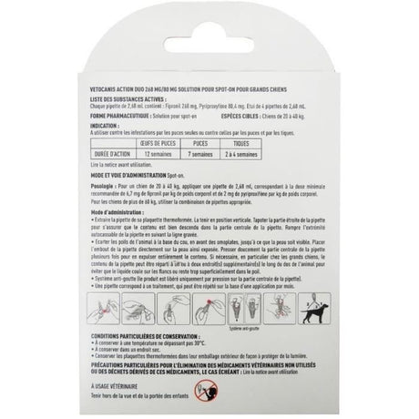 Pipettes - VETOCANIS - x4 Pipettes Anti-puces et tiques Duo 268mg/80mg pour Grands Chiens