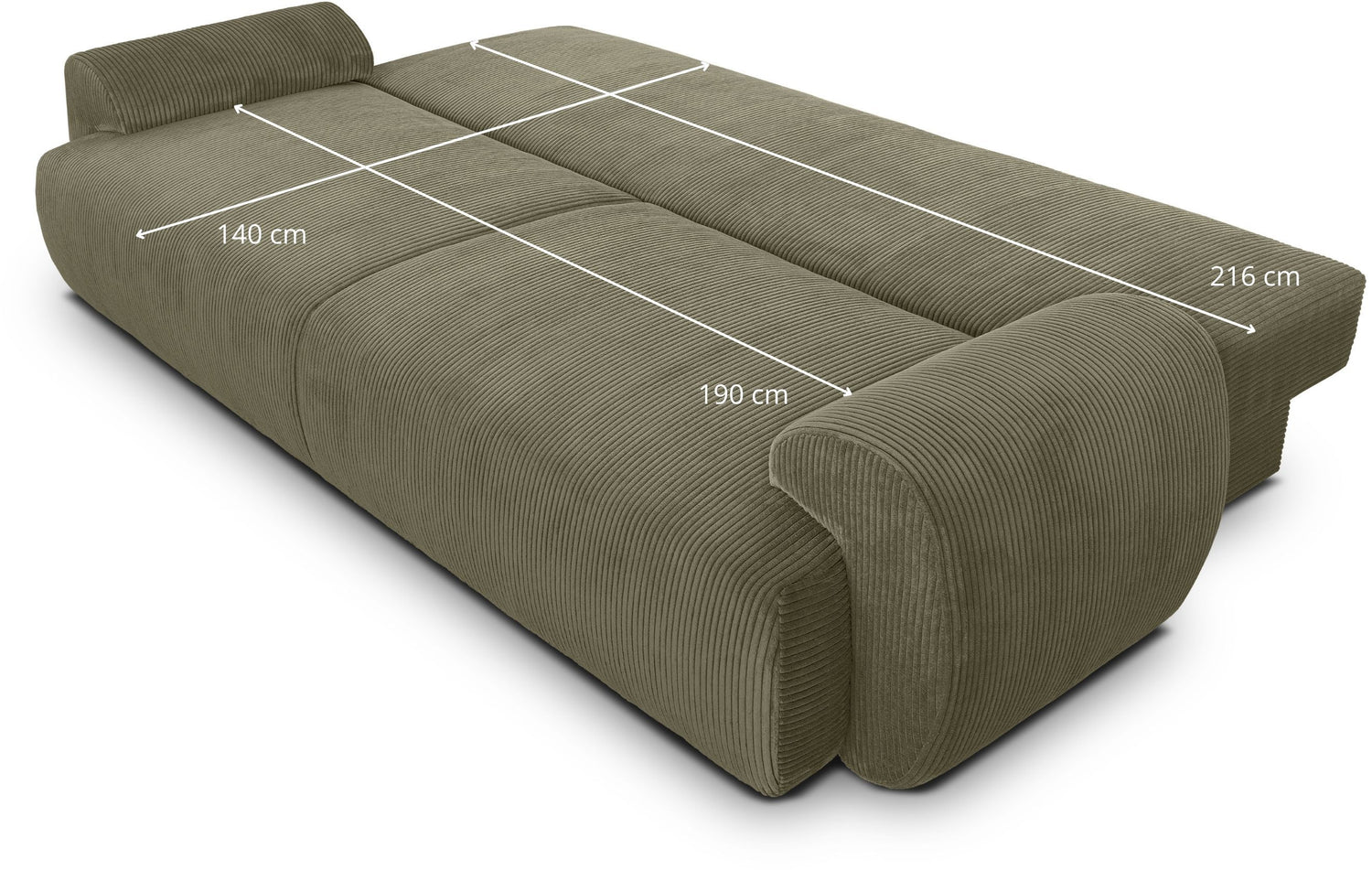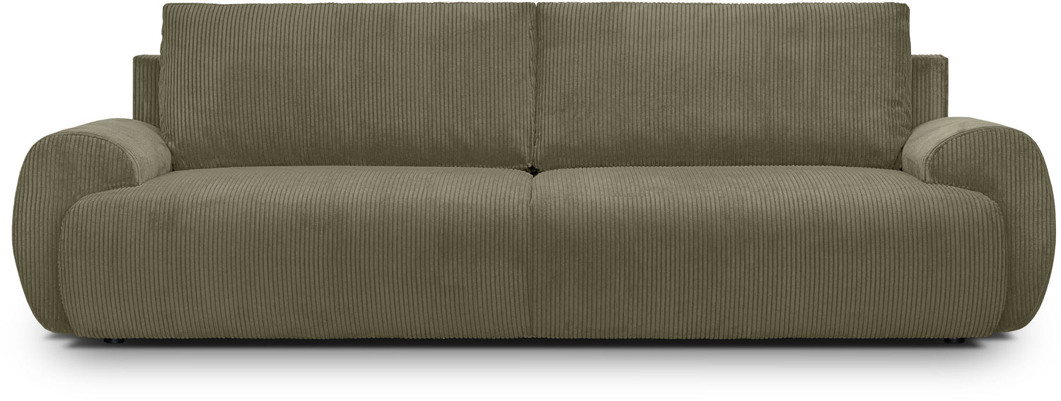 Canapé convertible - 3 places - MILO - Tissu velours côtelé Vert kaki - Coffre de rangement - 254 x 99 x 84 cm