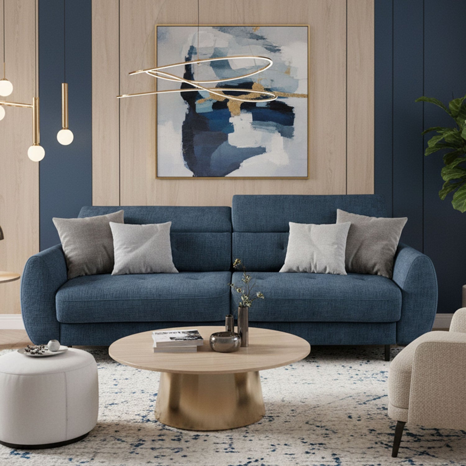 Canapé convertible express - 3 places - SAFIA - Tissu gauffré - Saphir - Matelas 15 cm - 226 x 105 x 76 / 94 cm - DUNLOPILLO