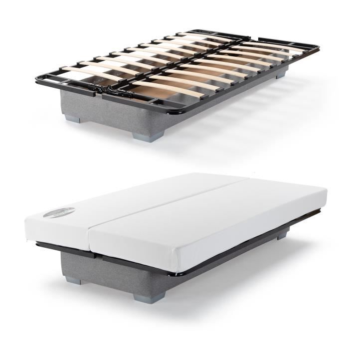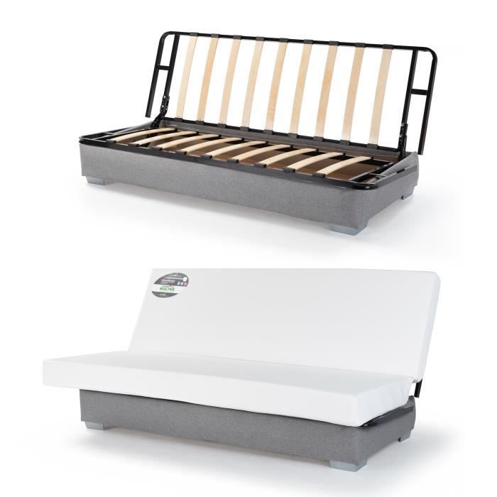 Banquette clic clac BELYNDA Comfort BULTEX - Tissu Gris + Coussins dÈco bleu - L193 x P95 x H101cm. Le canapÈ vous sÈduira par son rapport qualitÈ/prix, son style contemporain et ses revetements aux choix. Pratique et fonctionnel, il se transforme en couchage d'un simple mouvement. Gr‚ce a son matelas de qualitÈ (BULTEX), il vous permettra un usage quotidien. Matelas Bultex garanti 5 ans.