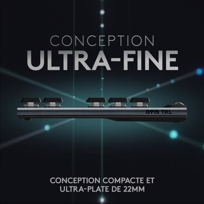 Le clavier G915 TKL est une nouvelle classe de clavier gaming mÈcanique sans fil comportant 3 sÈlections de switchs GL ultra-plats et la technologie sans fil LIGHTSPEED 1 ms de qualitÈ professionnelle. Il peut fournir 40 heures de jeu continu avec une charge complete. La technologie avancÈe LIGHTSYNC RVB entierement personnalisable permet de synchroniser l'Èclairage avec n'importe quel contenu et de personnaliser cha