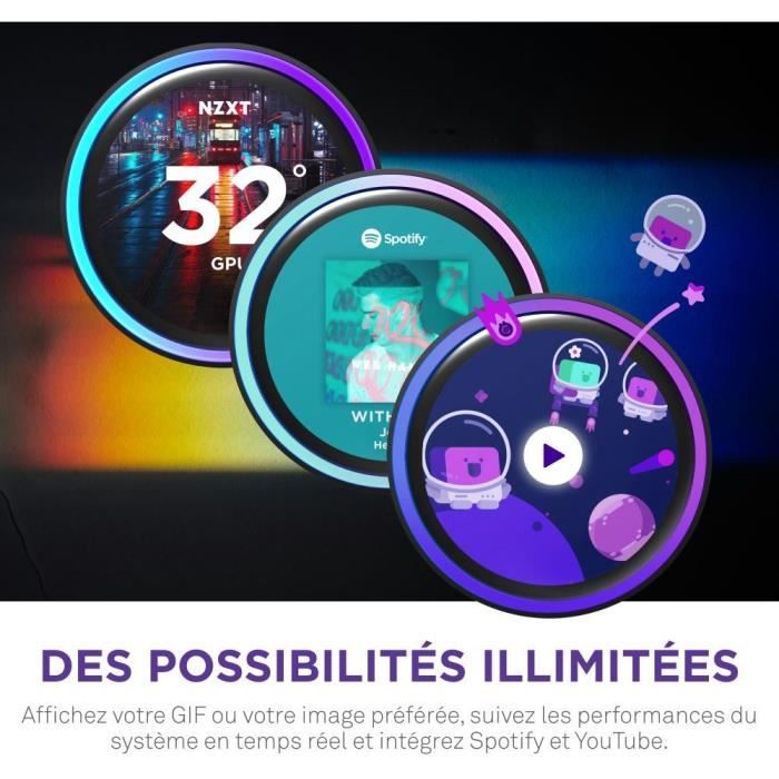 Le Kraken Elite est doté d'un écran LCD IPS amélioré, 30 % plus grand que la génération précédente, avec un nouvel anneau LED RGB, permettant aux utilisateurs de personnaliser leurs configurations. Grâce a NZXT CAM, les utilisateurs peuvent configurer leur Kraken Elite pour afficher des GIFs, les températures systeme et intégrer des services populaires tels que YouTube, Spotify et Google Photos.. Un nouveau parametre appelé RGB auto-sync permet a l'anneau LED RGB de s'adapter dynamiquement a l'image ou au GIF affiché. Avec ses possibilités illimitées de personnalisation, le nouveau Kraken Elite devient un outil essentiel pour créer une configuration cohérente qui reflete véritablement le style unique de chaque utilisateur.. . Le montage est simplifié grâce a un câble de raccordement unique depuis le radiateur, pour une installation propre et rapide.. La version RGB est équipée des ventilateurs NZXT RGB Core au cadre unique, reconnus pour leur design, pour un montage plus simple, plus rapide et plus propre que jamais.. Le Kraken Elite est compatible avec les sockets Intel® LGA 1851/1700, 1200/115X, et AMD® AM5, AM4.