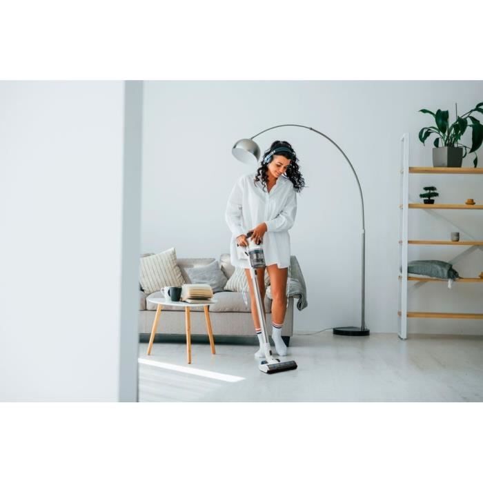 Aspirateur balai sans fil avec technologie cyclonique sans sac, particulierement flexible, puissance d'aspiration de 24 kPa, différents embouts et brosses. Vidage pratique et hygiénique du bac a poussiere. Capteur de poussiere garantissent un nettoyage minutieux et puissant. Filtre HEPA-H13