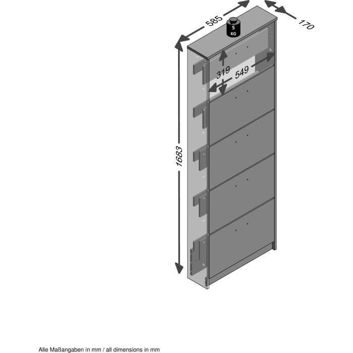 Meuble a chaussures petite profondeur - Décor blanc - 5 Abattants - 10 paires - L58,5 x H168,5 x P17 cm - Panneaux de particules mélaminés, protégés contre les rayures et l'humidité. Fabriqué en Allemagne
