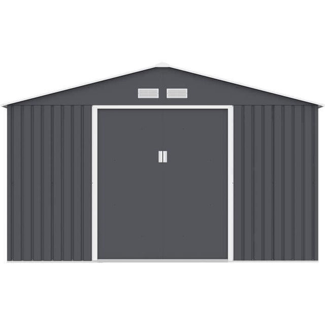 Abri de jardin en métal 10,85 m² - 340 x 319 x 210 cm - JUPITER - Kit d'ancrage inclus, 2 portes coulissantes - Gris
