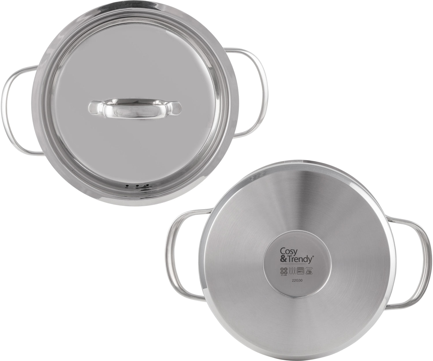 La série Daily en inox est un must pour tout cuisinier. Le fond en aluminium encapsulé assure une conduction thermique idéale et le trou de vapeur permet de réguler l'humidité. Toutes les poeles et casseroles sont brillantes a l'extérieur et mates a l'intérieur. Notez aussi l'indicateur de mesure pratique. Les poignées sont en inox et soudées a la casserole. Daily convient a toutes les plaques de cuisson (meme induction) et va au four jusqu'a 200°C. Cette série peut aller au lave-vaisselle.