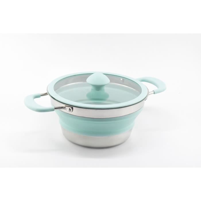Faitout rétractable en silicone rétractable. Couvercle en verre fourni. Convient pour tous types de feux sauf induction et passe au four jusqu'a 200°C. Couleur principale: Bleu. Matieres: Silicone. Dimensions: Diametre 20 cm. Compatibilité lave-vaisselle: Oui.