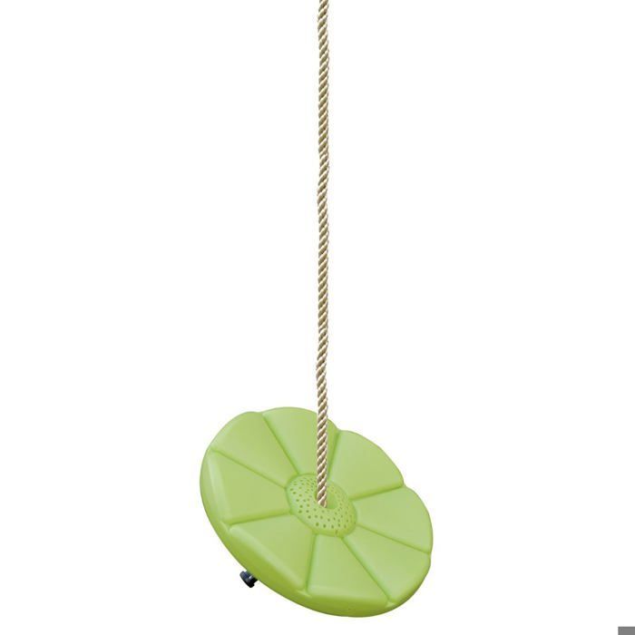 Balançoire disque pour portique de 1.90 a 2.50 m. Coloris vert. Assise plastique corde en polypropylene réglable couleur chanvre.