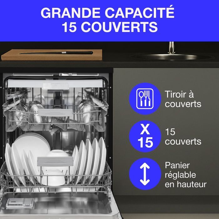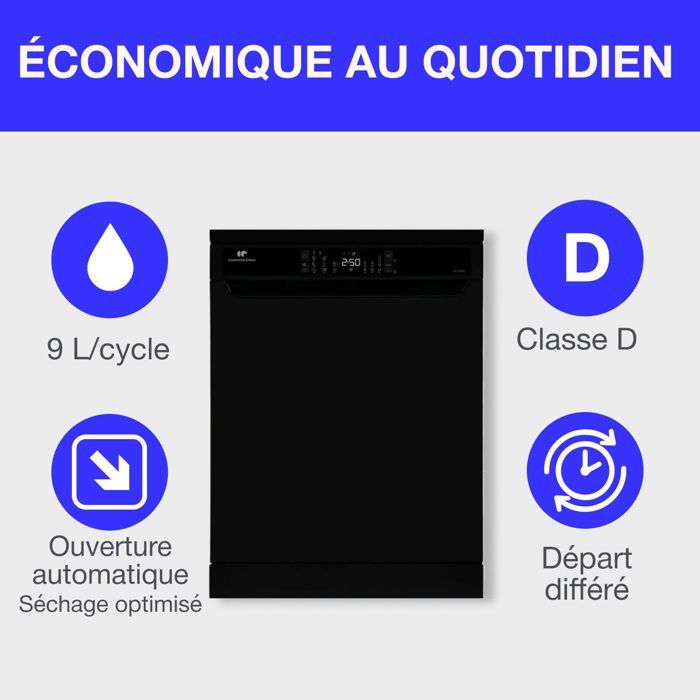 Lave-vaisselle pose libre CONTINENTAL EDISON - 15 couverts - Largeur 59,8 cm - Classe D - moteur induction - 39 dB - Noir