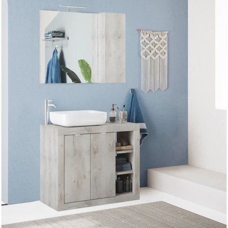 Meuble simple vasque - 2 Portes + 3 niches - L 92 x P47 x H 90cm - effet chene pin clair