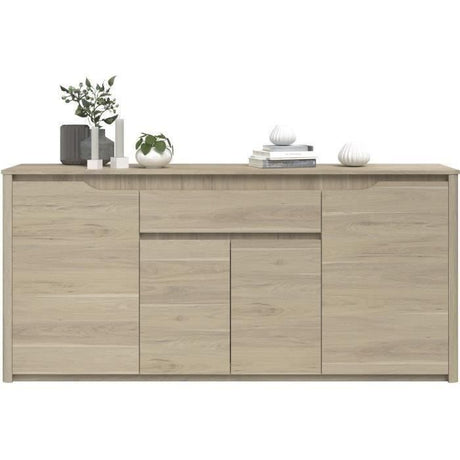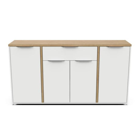 Ensemble Salon ACCESS : Table basse + Banc TV + Enfilade 4 portes - Decor chene Hamilton et blanc