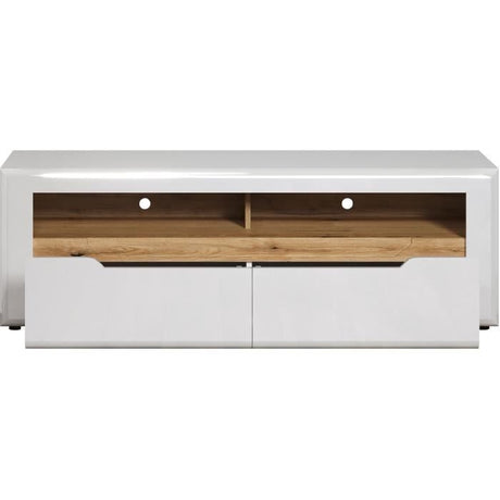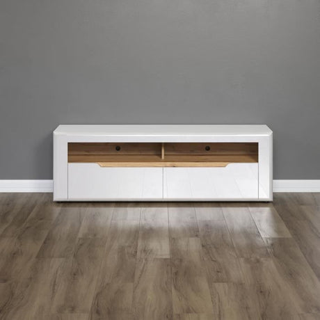 Meuble TV - KIOTO - Blanc Artik / Chene Canadien - 2 portes - 2 niches - 130 x 42 x 36 cm