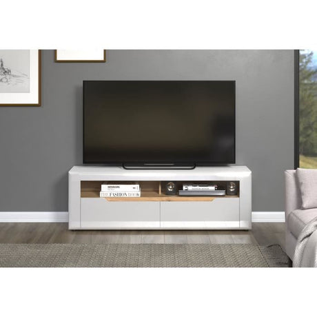 Meuble TV - 4 niches 2 tiroirs - Blanc / Chene - 117,2 x 39,1 x 57,4 cm ARO