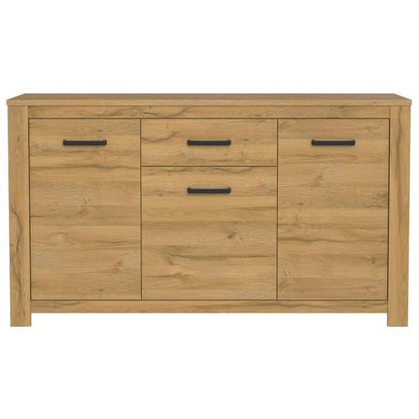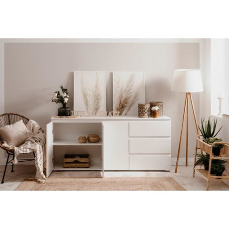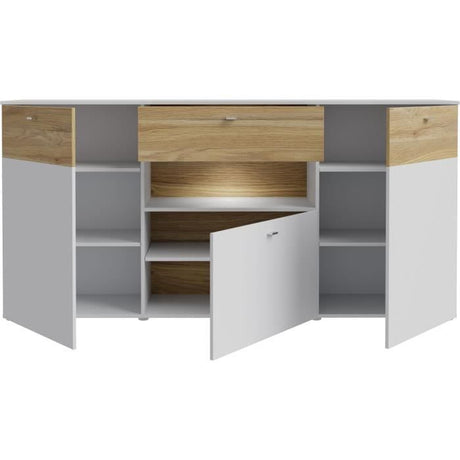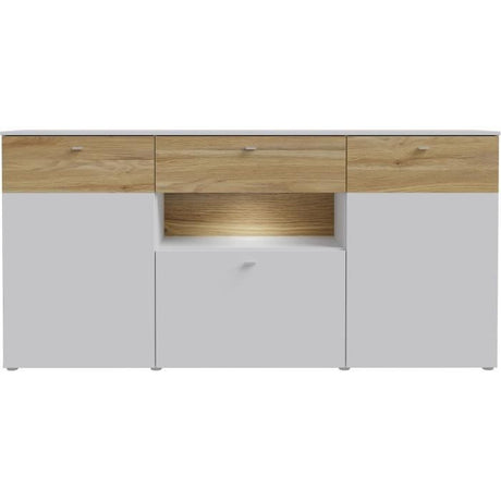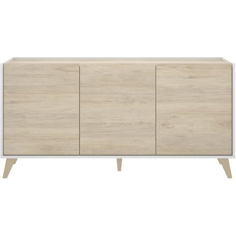 Buffet bas NESS - Mélamine Décor bois clair et blanc - 3 Portes - L 155 x P 43 x H 75 cm