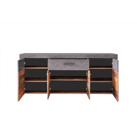 Buffet bas INDY 4 Portes et 1 Tiroir - Mélaminé bois vieilli et gris mat - L 178 x P 40 x H 77 cm