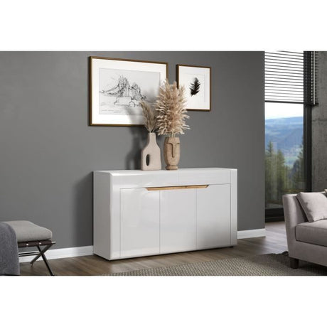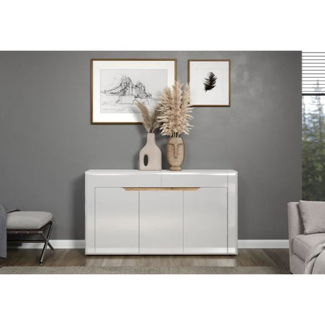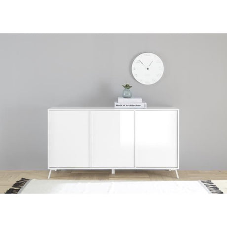 Buffet BASICO - Décor blanc laqué brillant - 3 Portes - L160 x P42 x H85,8 cm