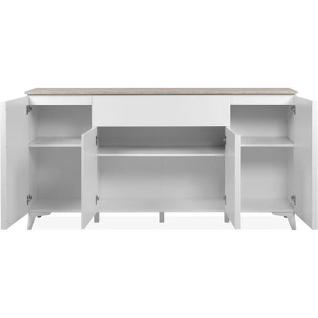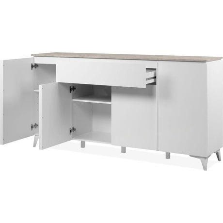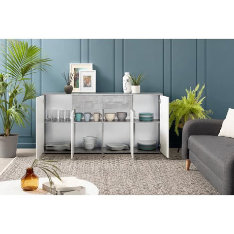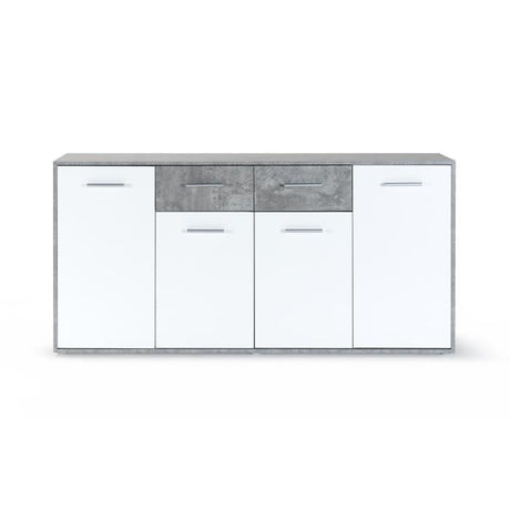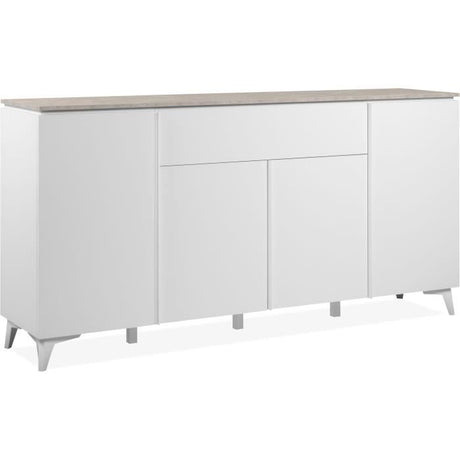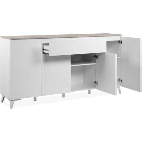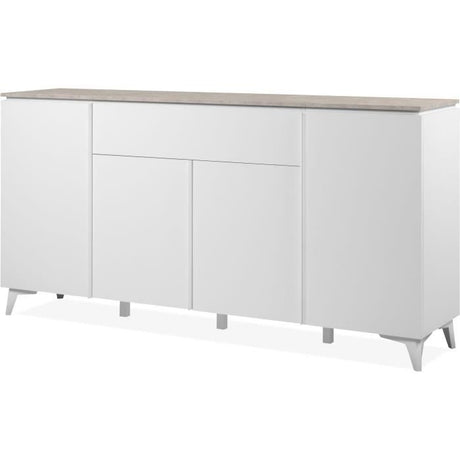 Buffet bas PILVI - 4 portes et 2 tiroirs - Blanc et béton clair - L 162,3 x P 34,2 x H 88,1 cm