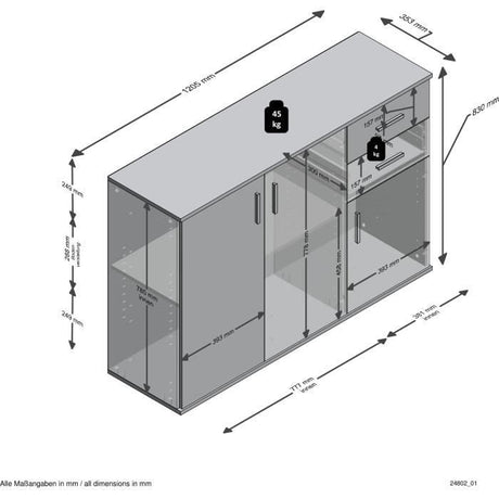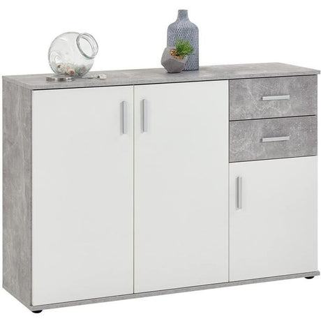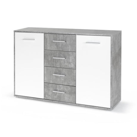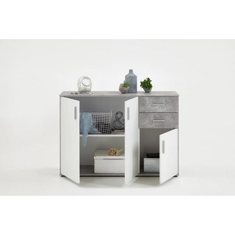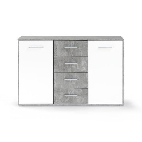 Buffet bas PILVI - 2 portes et 4 tiroirs - Blanc et béton clair - L 122,6 x P 34,2 x H 81,1 cm