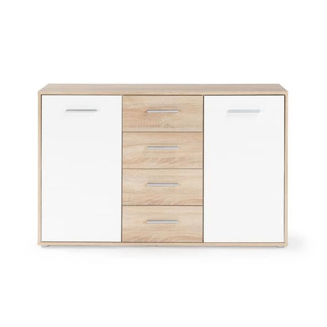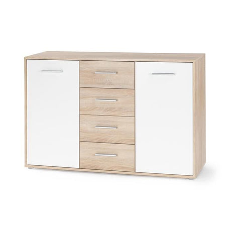 Buffet bas PILVI - 2 portes et 4 tiroirs - Blanc et chene sonoma - L 122,6 x P 34,2 x H 81,1 cm