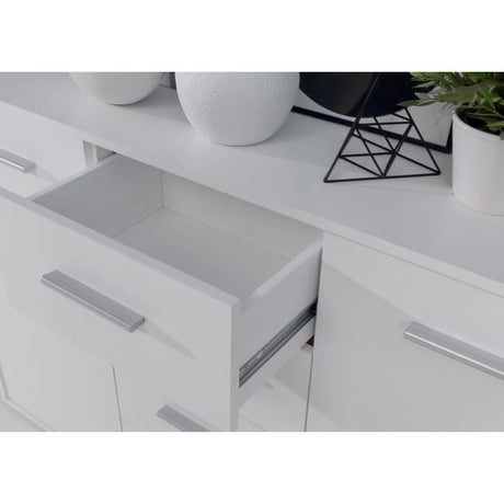 Buffet BASICO 2 Portes 3 Tiroirs Blanc Laqué brillant - L210xP42xH85,8 cm