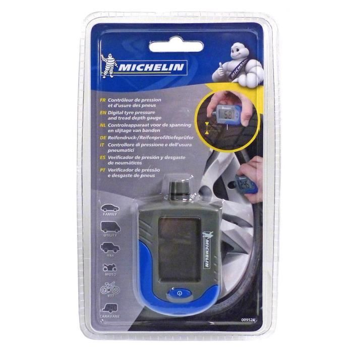 ContrÙleur de pression nouvelle gÈnÈration avec mesure de profondeur du pneu. Affichage digital de la pression en BAR avec une prÈcision de 0,01 bar. Affichage de la profondeur des rainures en mm. Piles fournies. Couleur principale : Bleu.