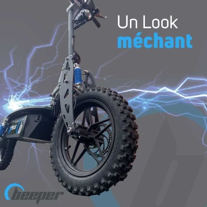 La trottinette electrique Beeper FX1600-S est LA trottinette tout-terrain ! Grâce a ses pneus gonflés et crantés, elle vous amenera partout. Son moteur haute performance de 1600W peut atteindre une vitesse maximum de 40 km/h (sur voie privée). Sa batterie Lithium 48V 18Ah vous permet de parcourir jusqu'a 40km.